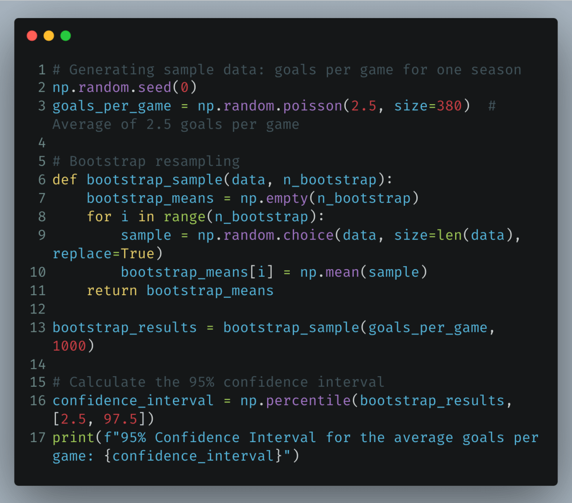 - Bootstrap: This involves taking repeated samples from the observed data with replacement. For instance, estimating the confidence interval for average goals scored per match.