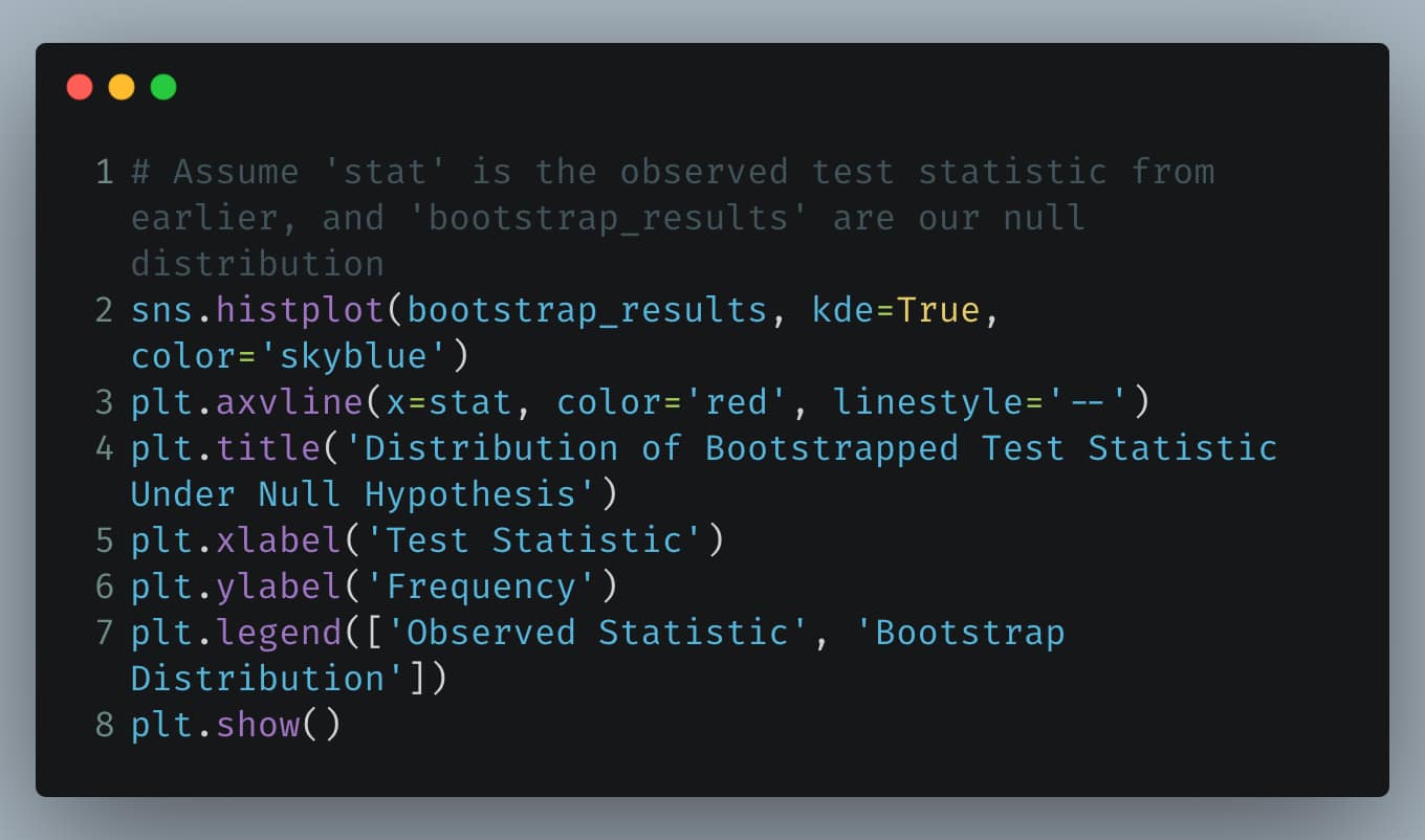Creating a visualization that simulates the distribution of a test statistic under the null hypothesis can help intuitively explain p-values. Here’s how you could implement this in Python: