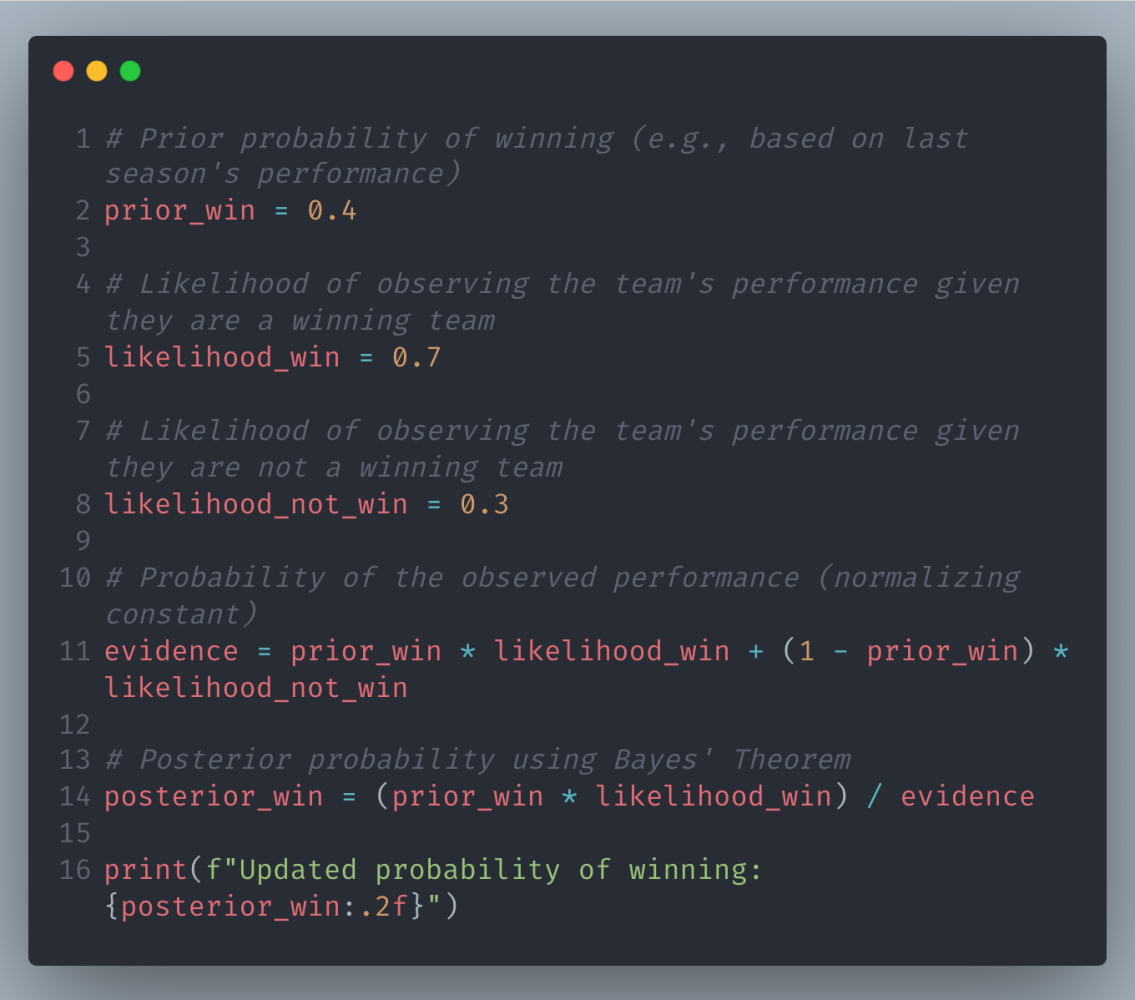 In this code, we calculate the updated probability that a team will win based on new performance data, applying Bayes’ Theorem.