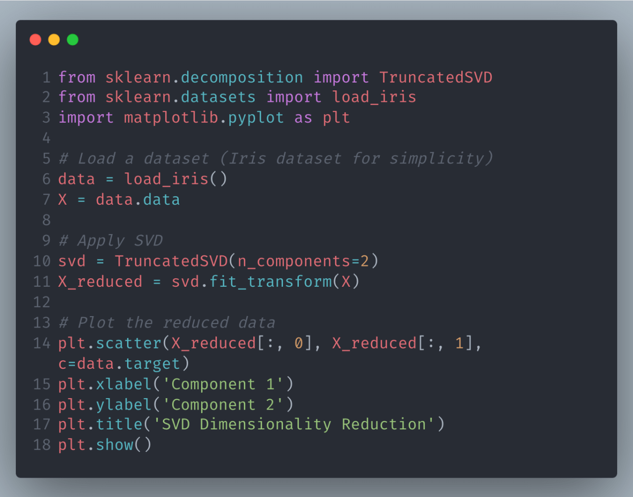 This code uses Singular Value Decomposition to reduce the dimensionality of the Iris dataset, making it easier to visualize and analyze.