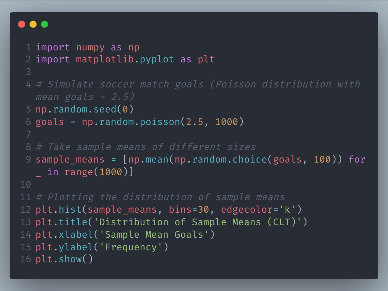 In this code, we simulate the goals scored in soccer matches using a Poisson distribution and demonstrate how the sample means form a normal distribution, validating the Central Limit Theorem.