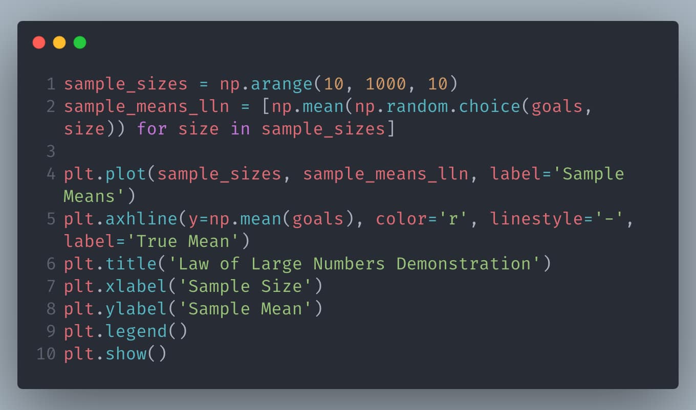 This example shows how the sample mean of soccer goals converges to the true mean as the sample size increases, illustrating the Law of Large Numbers.