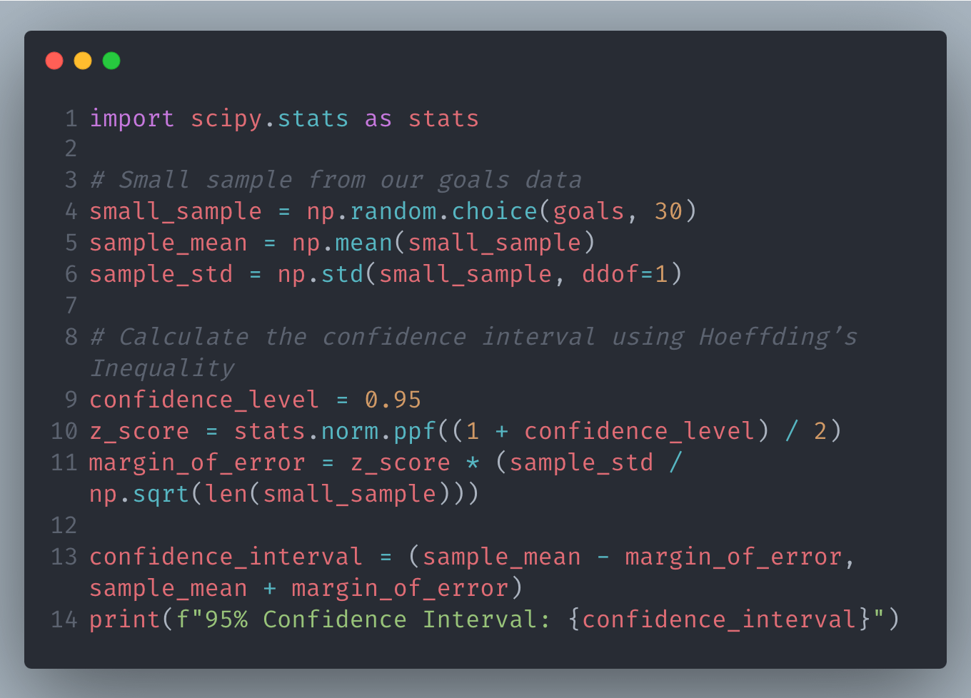 This code calculates a confidence interval for the average goals scored using a small sample, leveraging Hoeffding’s Inequality.